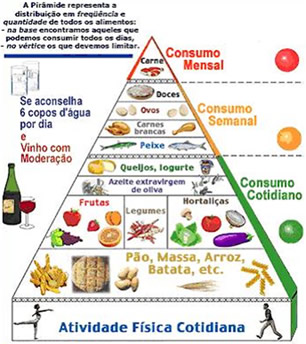 Na pirâmide acima, alimentos que contém amido como massa, pão, batata, podem ser consumidos diariamente, porém de forma moderada, assim como frutas, verdura e leite. Em direção ao vértice da pirâmide estão os alimentos que devem ser consumidos em quantidades semanais menores como carne, ovos e doces.